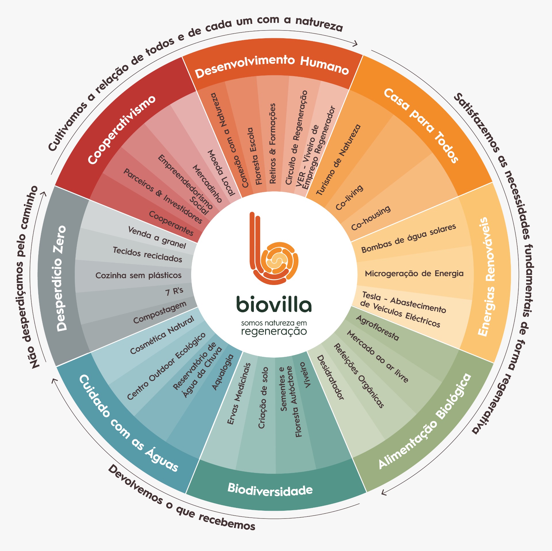 Biovilla's value proposition is simple, direct, and transparent. It is based on the principles of Regeneration and focuses on the eight assumptions of its mandala: Cooperativism, Personal Development, Organic Food, Home for All, Renewable Energy, Water Care, Native Forest, and Zero Waste.