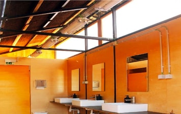 The bathroom area, divided in 4 blocks, is equipped with 10 toilets, 8 showers, and 10 washbasins. Hot water is supplied by a solar system and drinking water is available.