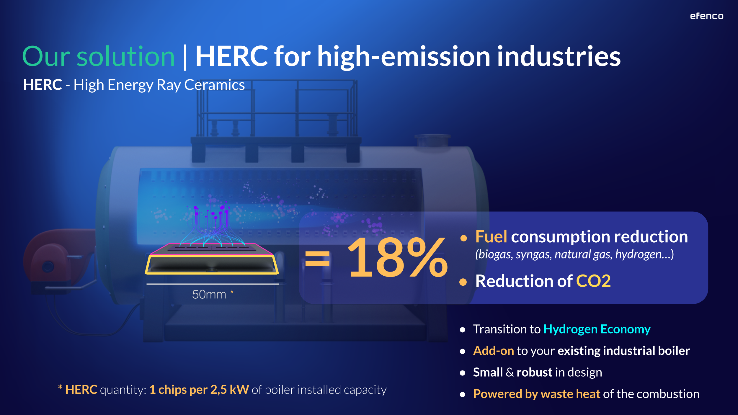 Efenco is currently pre-revenue and preparing for the first industrial pilots. The promoter's commercial goal is to provide HERC technology for +18% fuel and CO2 reduction for energy-intensive industry manufacturers.