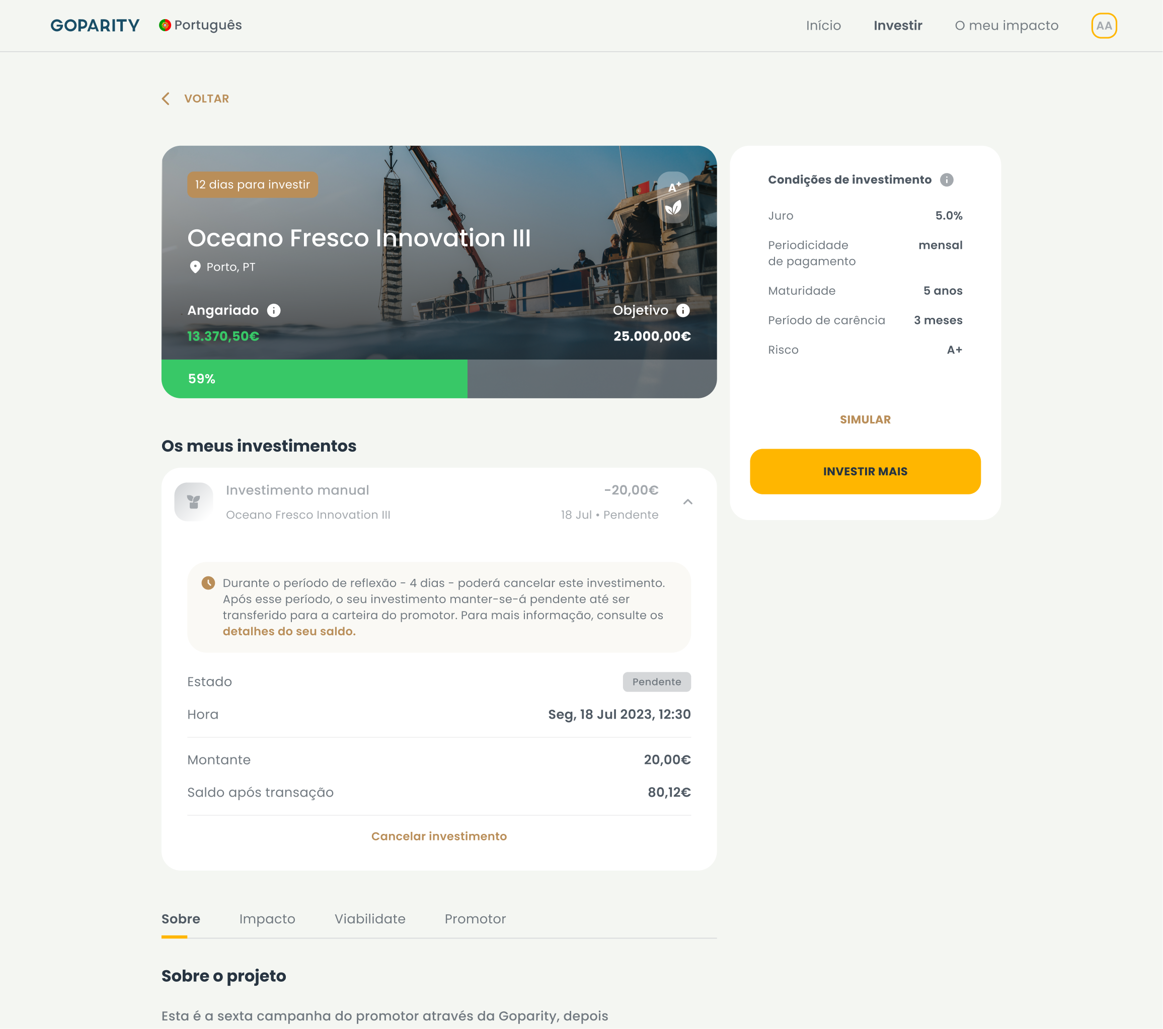 Até ao fecho da campanha, o montante que investiu aparecerá na sua carteira como saldo pendente, a não ser que decida cancelar o investimento dentro do período de reflexão de 4 dias, caso em que o montante do seu investimento cancelado voltará a aparecer como saldo disponível na sua carteira Compreenda aqui as diferenças entre saldo disponível e saldo pendente