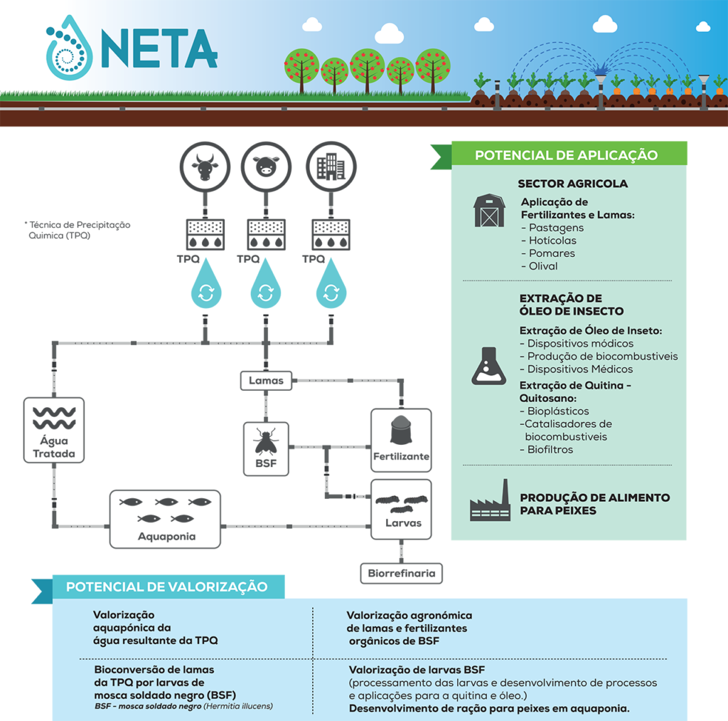 Liderado pela Ingredient Odyssey SA (EntoGreen), o projeto NETA pretende optimizar e utilizar a Técnica de Precipitação Química, que foi desenvolvida pelo Instituto Politécnico de Beja (IPBeja), no tratamento de águas residuais, utilizando a água tratada para fins agrícolas, sendo as lamas biodigeridas por insetos, nomeadamente larvas de mosca soldado negro (Hermetia illucens).