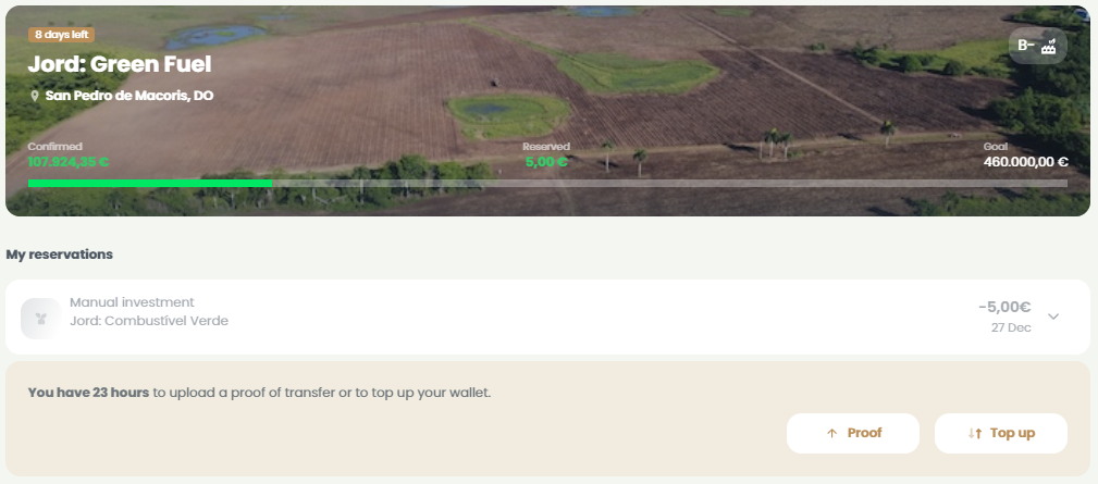 To see the updated status of your reservation, click on the respective project. Here you can also submit the proof of transfer or top up your wallet.