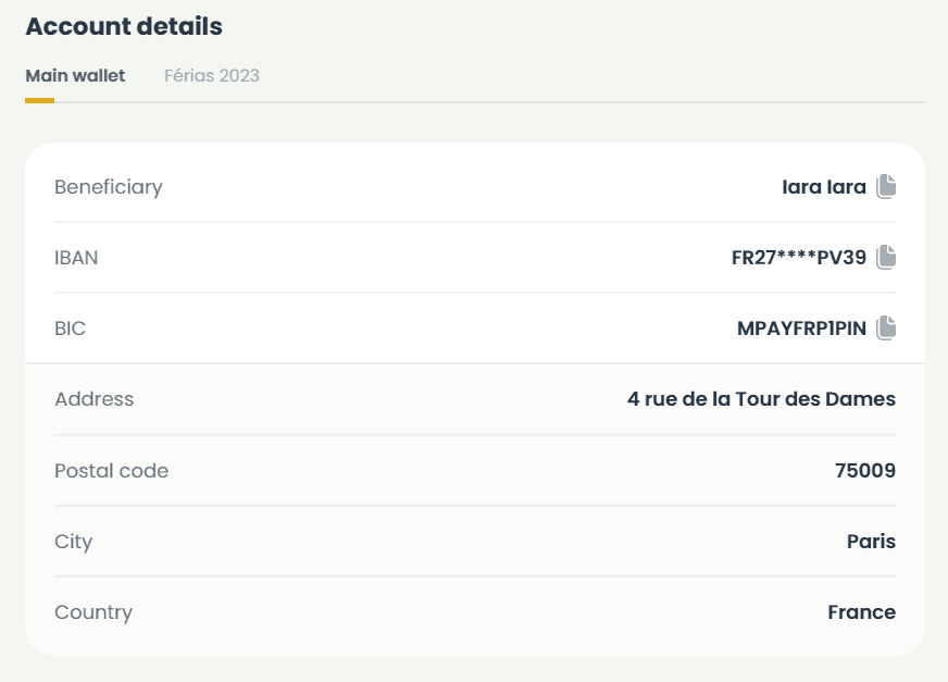 When you create an account, a personal digital IBAN will automatically be generated in order for you to perform financial transactions. You can check your IBAN in your account settings: